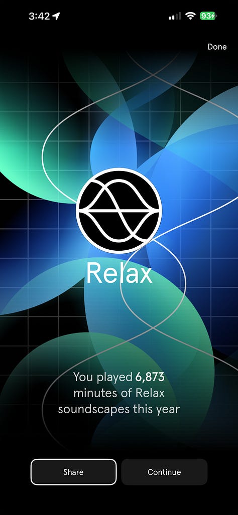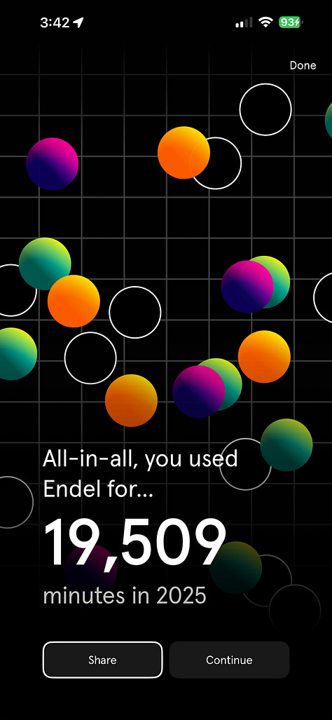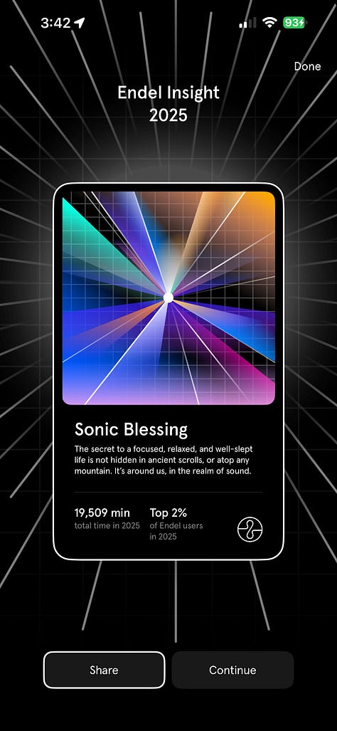 It’s not often I find a “new app” that I find myself gravitating to, and even paying for. 2025 was the year I discovered “Endel”, a soundscape app to help you create a vibe. I used it for 19,500 minutes, or 325 hours.