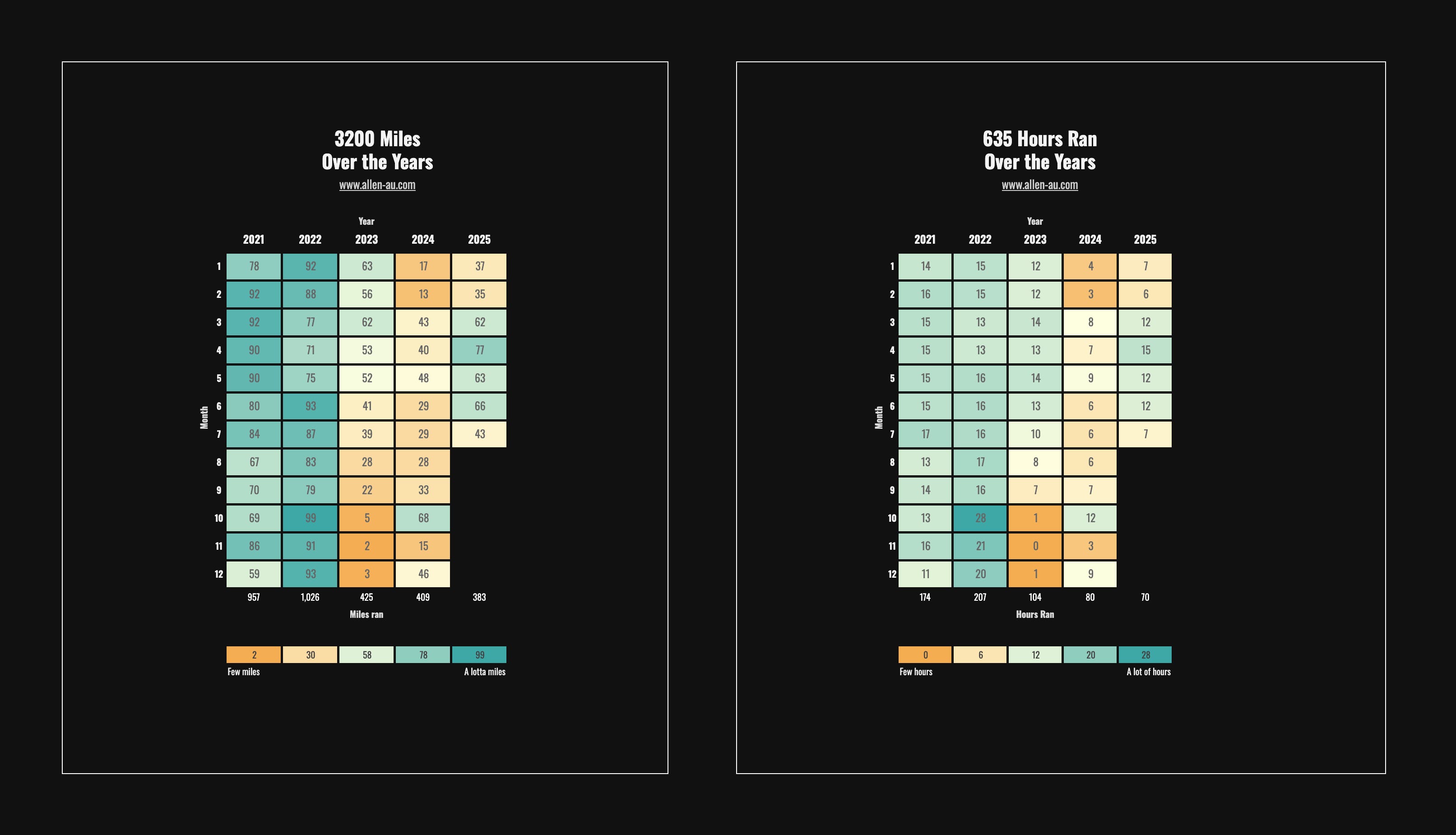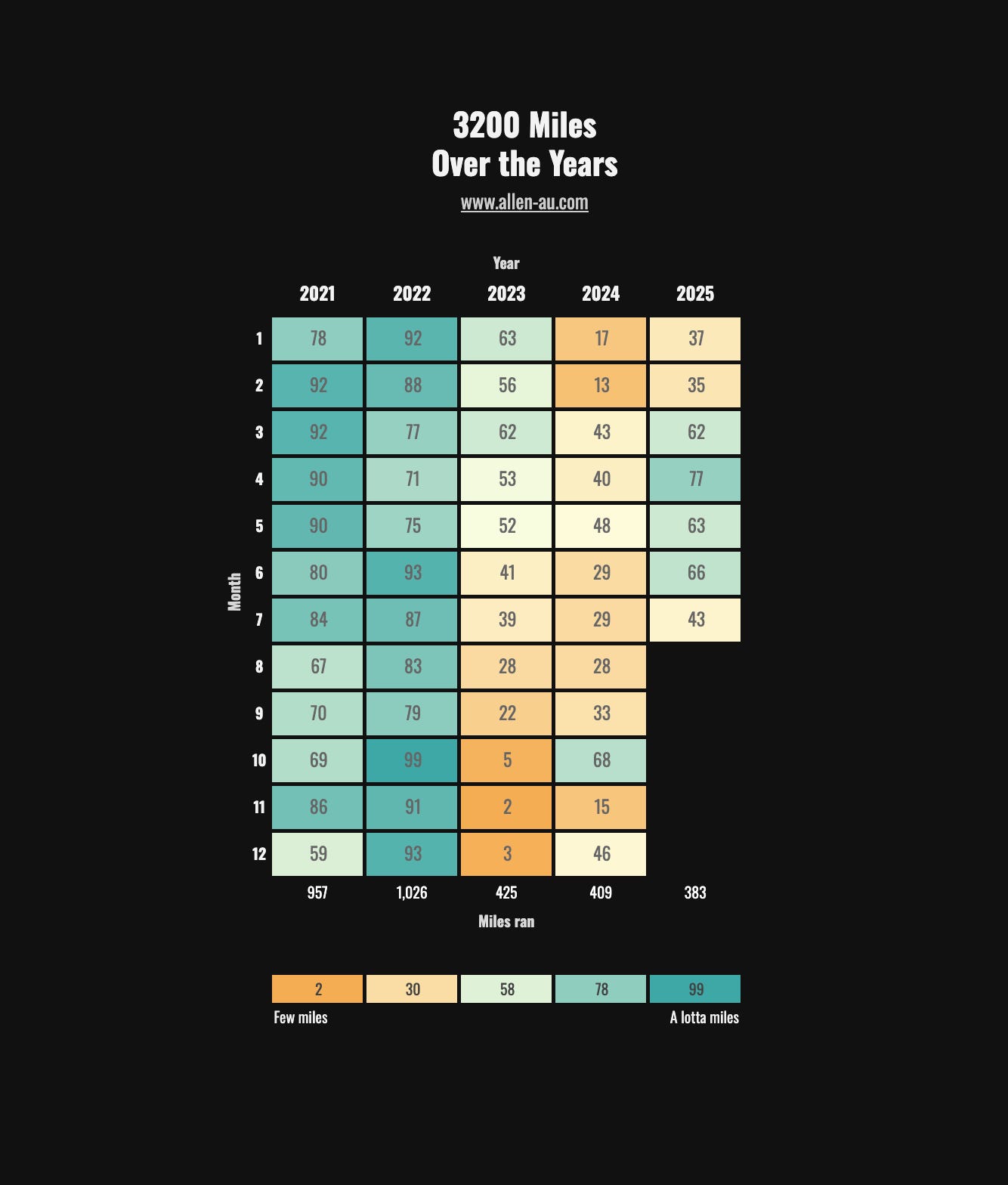 To date, I’ve ran 3,200 miles, or ~5,000 kilometers.