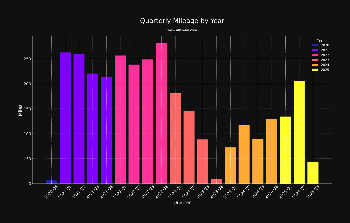 My mileage has gone down beginning the middle of 2023. I started doing Lifetime and started taking fitness classes as a way to enhance my physical routines. Those are not factored in here, and you can clearly tell the reduction in mileage starts to happen in Q4 of 2023.