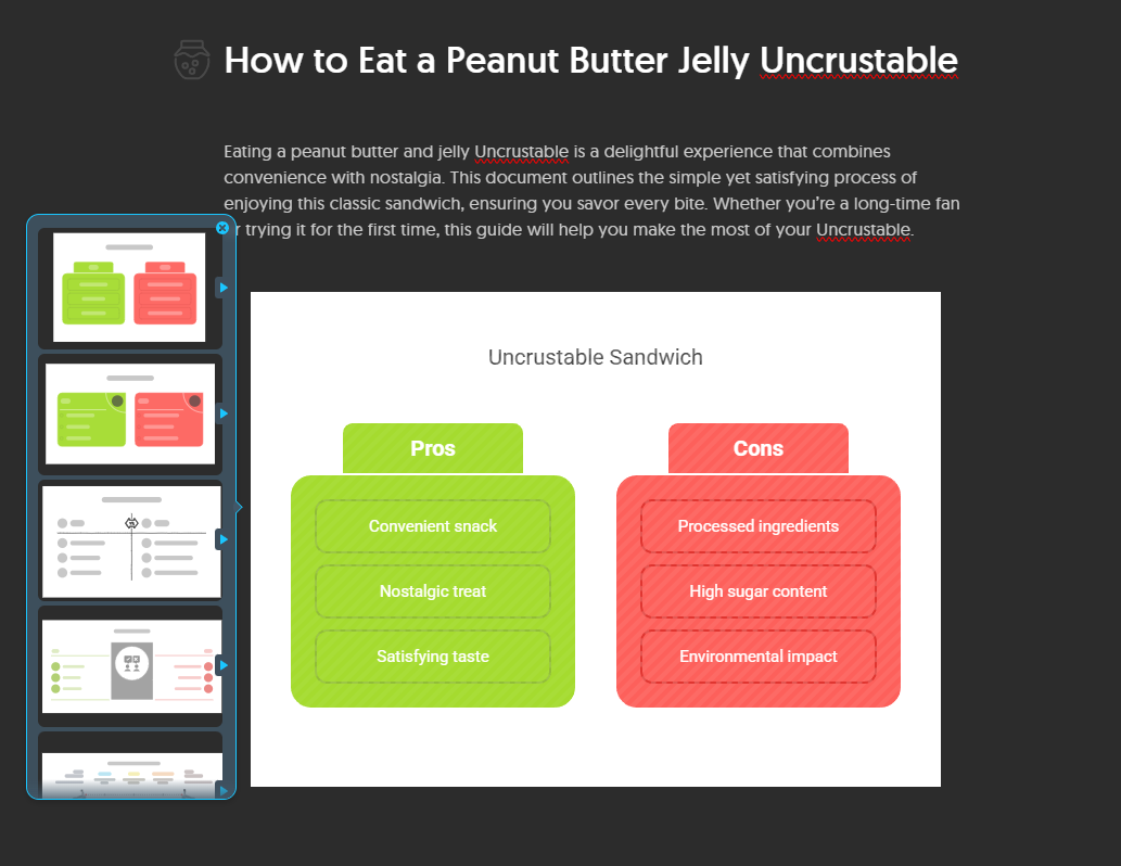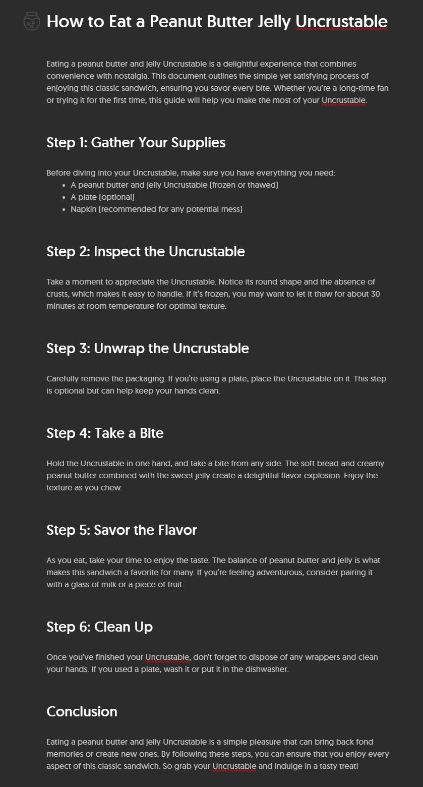 What did I use to generate the text for the AI Visualization in Napkin.ai? I used Napkin.ai itself, though it’s text gen is very weak. The question, or prompt, was “How to Eat a Peanut Butter Jelly Uncrustable” as I was interested in seeing the visual AI capabilities.