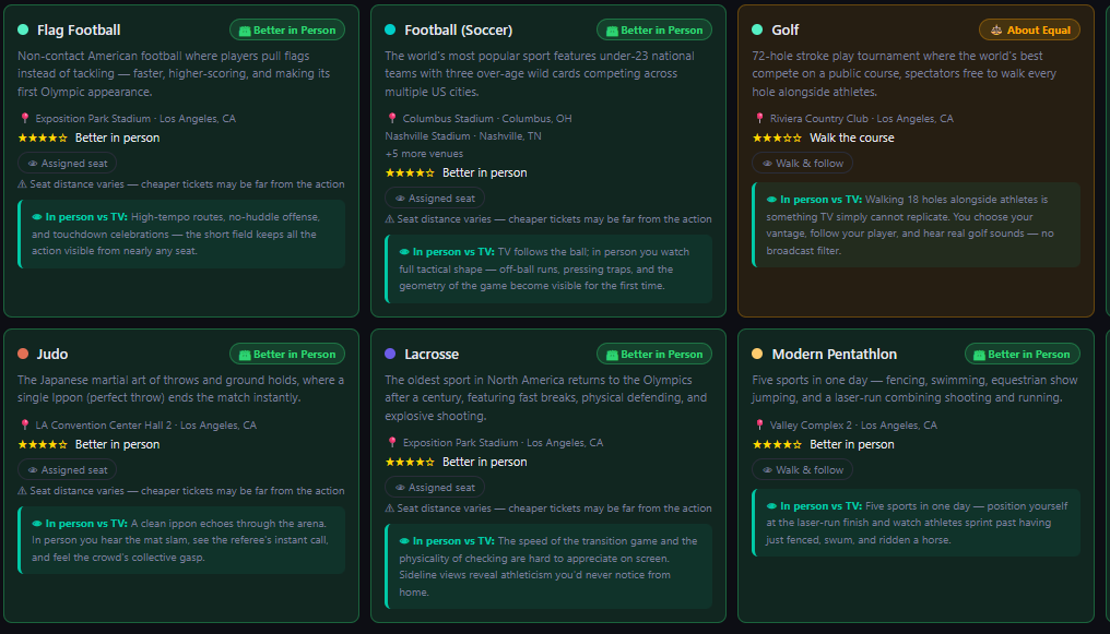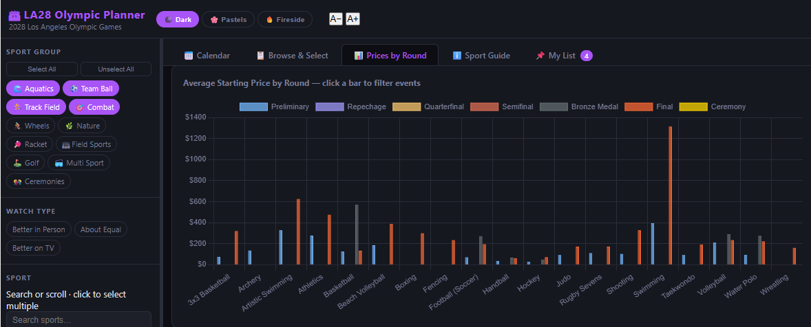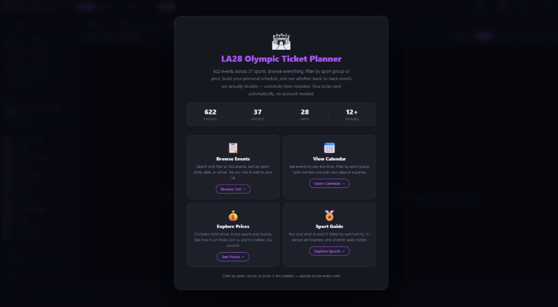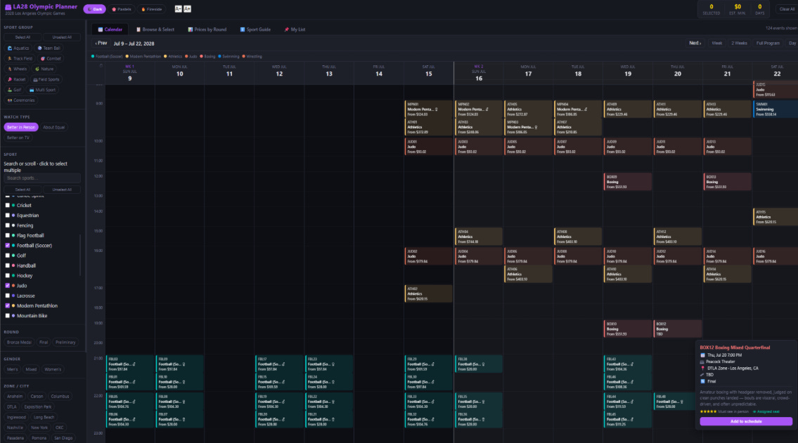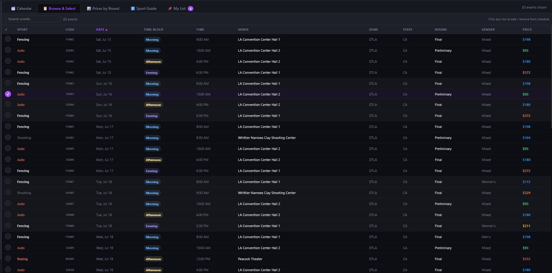 I made a website that allows you to filter, research, and plan your LA Olympic events based based on any amount of variables, without the need to having to have too many tabs open.