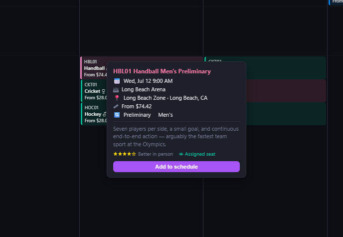 Now I know I can clearly open another tab, get it side by side, and use it to reference the [LA28 Olympic Games Calendar]. I can even use their [site ] but that subjugates you to a sluggish experience filled with the browsing experience of looking at the equivalent of someone’s Xanga for each sport. Go ahead, try to learn about the events on the [Official Olympic competition schedule].